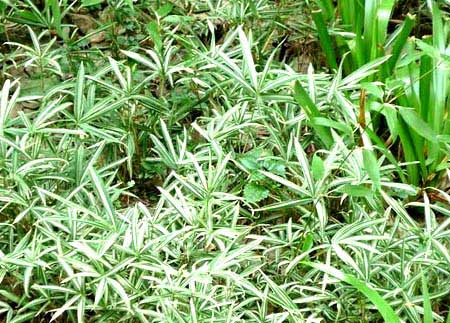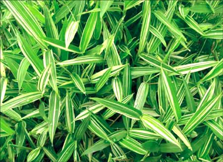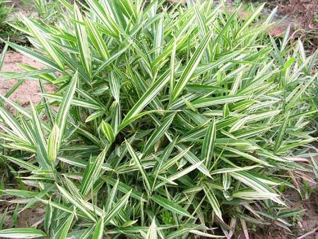 赤竹属,低矮竹类,秆每节具2至数分枝或下部为1分枝。叶片狭披针形,绿色底上有黄白色纵条纹,边缘有纤毛,两面近无毛,有明显的小横脉,叶柄极短;叶鞘淡绿色,一侧边缘有明显纤毛,鞘口有数条白缘毛。笋期4~5月。