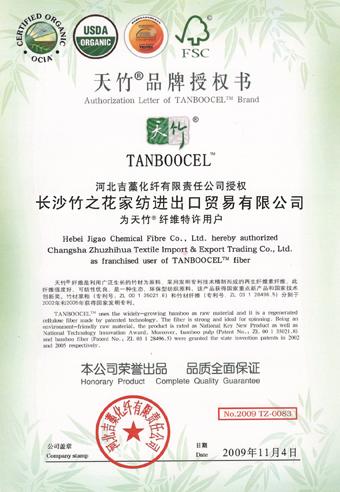 2009年11月4日,天竹联盟正式授权竹之花为天竹纤维特许用户。这体现了联盟以及整个竹纤维产业链对竹之花诚信务实的经营理念的认可,也验证了竹之花产品所采用的原材料均为天竹纤维,并确保其含量符合联盟要求。