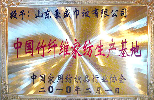 山东豪盛巾被有限公司于2010年二月一日被中国家用纺织品行业协会授予"中国竹纤维家纺生产基地"称号!