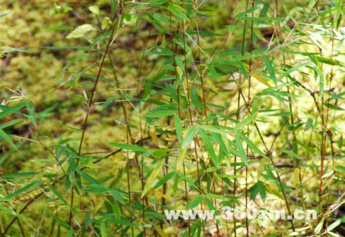 分枝习性高,通常在竿的第4—6节(亦即竿高一半处)开始分枝,每节通常为3枝,或以后能成为多枝,枝与竿作200一300的夹角斜展。笋紫红色或淡绿色而先端带紫红色,无毛,背部有紫色小斑点;箨鞘厚纸质,三角状长圆形,常较其节间为短,无毛,纵肋纹显著,小横脉稍可见,边缘生纤毛;箨耳微小或不存在,鞘口两侧初时有数条紫色继毛,后易脱落;箨舌截形,绿色,高约o.5毫米;箨片外翻,绿色或先端带紫红色,无毛。末级小枝具2—4叶;叶鞘长2—4厘米,无毛,纵肋明显,边缘起初有纤毛;叶耳微小或无,鞘口两侧具数条波曲的继毛,后者初时为紫色,后变为灰白色,长5—7毫米;叶舌截形,高约0.5毫米;叶片披针形,长3—9厘米,宽(4)8—11(14)毫米,纸质,两面均无毛,先端渐细尖,基部浑圆,次脉3—4(5)对,小横脉明显,叶缘具小锯齿而粗糙;叶柄长l一2毫米,无毛。总状花序长4—6厘米,具小穗3—5枚,或有时为圆锥花序,长10—13厘米,此时则具8或9枚小穗,花序主轴及分枝均无毛;小穗柄直立,长8—22毫米,微扁,绿色,无毛,腋间具瘤枕;小穗紫红色,长2—4厘米,含(4)5—7朵小花;小穗轴节间长3—5毫米,被灰白色或黄色绒毛,在中部以上毛尤密而较长,近内稃之一侧扁平;第一颖锥形或三角状卵形,长约2毫米,具1脉,无毛;第二颖卵状披针形或披针形,长5一8毫米,具1或3脉,先端长渐尖,除脊上有时疏生小硬毛外,余处无毛;外稃卵状披针形,长9——14毫米,具7脉,无毛或边缘的上部被纤毛,先端作芒针状;内柞长7---12毫米,背部在脊上生小纤毛,脊问具1脉,先端具2尖齿;鳞被中的前方2片较大,卵形,长1—1.5毫米,后方1片较窄,披针形,长约1毫米;花药紫红色,长5——6毫米,先端具2钝圆头,基部呈箭镞形;子房椭圆形,无毛,长约1毫米,花柱1,但在上部可2裂,柱头3,羽毛状,长(1)2——3毫米。