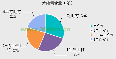 竹材均可制取竹纤维,如丛生竹中纤维长度在2.2mm以上的竹种有26种,竹纤维含量在44%~50%的有27个竹种,竹纤维素含量在50%以上的有12个竹种。因丛生竹砍伐低,竹纤维制成率低,一般不伐用.毛竹纤维素含量相对较高,开发竹纤维都采材于毛竹。毛竹的生长地域不同、产地不同、竹龄不同、季节不同、竹秆部位不同、竹子生长土壤酸碱性程序不同、日照时间不同等,其纤维素含量也不同.不同竹龄毛竹中的纤维素含量见如下图: