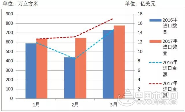3月份进口木材数量、金额及变化