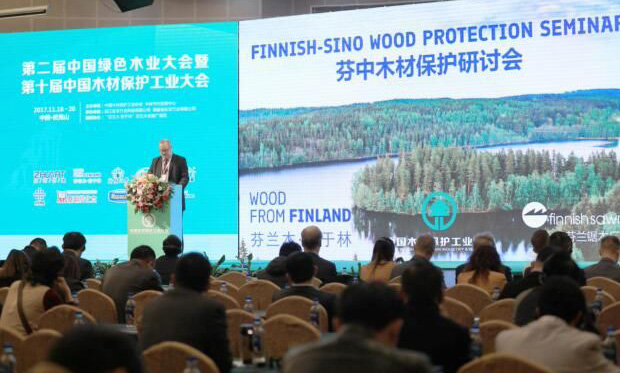 2017年11月19日,由芬兰贸易投资旅游促进总署、芬兰锯木产业协会、中国木材保护工业协会、“芬兰木?秀于林"芬兰木业推广项目共同举办的芬中木材保护研讨会作为第二届中国绿色木业大会暨第十届中国木材保护工业大会分会在福建省南平市顺利召开。芬兰经济事务与就业部部长顾问Reima Sutinen先生和中国木材保护工业协会会长陶以明先生的欢迎致词拉开了研讨会的序幕。来自中芬两国锯木加工、木材流通、木材防腐、阻燃、干燥、改性行业的近350多位行业专家和企业代表出席了此次研讨会。”芬兰木?秀于林“芬兰木业推广项目高级顾问高雅女士主持了本次研讨会。