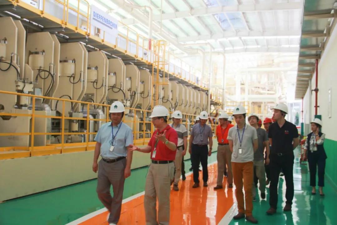 兔宝宝董事长丁鸿敏一行首先参观了丰林南宁工厂年产30万立方米超强刨花板生产线