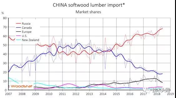 俄罗斯在中国木材市场的市场份额正以创纪录的水平增长。加拿大市场份额的平滑线在该国处于非常低的水平。如图表所示,俄罗斯和加拿大市场占有率之间有很强的相关性。欧洲主要出口国的市场份额正在下降。请注意,这些是平滑的序列,导致滞后趋势线,不反映个别月份的重大变化。