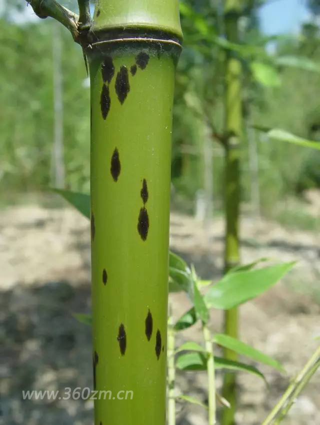 秆高8~22米,直径3.5~7厘米;节间鲜绿色,圆筒形,在具芽的一侧有狭长的纵沟,秆环及箨环均甚隆起,两者相距3毫米;秆箨长20~30厘米,宽10~20厘米,硬纸质兼革质,背部较平滑,疏生黄色小刺毛,具大小不等之淡墨色斑点,箨耳不发达,箨舌短。长不及3毫米;箨叶作长三角形或带状。主枝三棱形或为四方形,实心或仅有小如针孔之中空。最后小枝单生,顶端具叶3~6枚;叶鞘棕黄色,叶片长椭圆状披针形,大都长5~20厘米,宽10~25毫米,先端渐尖,基部楔形,上面灰绿色,下面淡绿色。小穗丛1至数个,腋生或顶生于小枝上,通常每1小穗丛基部托以4~10枚佛焰苞;小穗含花2~5朵,狭披针形,长2.5~3厘米;颖1或2枚,或缺如;外稃披针形,多脉;内稃狭披针形,先端2裂,鳞被3枚,矩形;雄蕊3;子房近于三角锥形,花柱细长,柱头3裂,稀疏羽毛状。笋期4~7月。花期4~6月。栽培于庭园或野生山间。分布长江流域以南各地及四川、山东、河南、广西等地。本植物的箨(斑竹壳)、花(斑竹花)亦供药用。