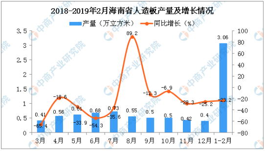据中商产业研究院数据库显示,2018年2-4季度海南省人造板产量逐渐下降,2019年1-2月海南省人造板产量为3.06万立方米,同比下降23.2%。