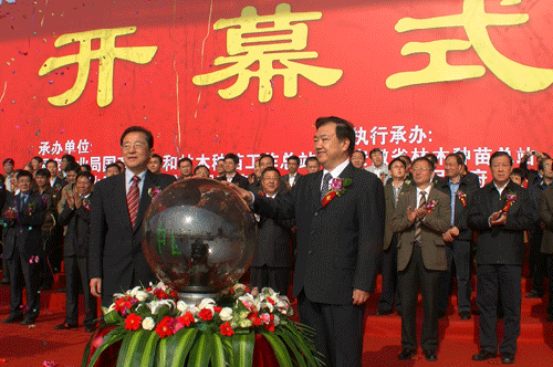 11月7日,2010中国·合肥苗木交易大会在安徽省合肥市肥西县中国中部花木城开幕。国家林业局局长贾治邦与安徽省省长王三运共同启动大会开幕式水晶球。