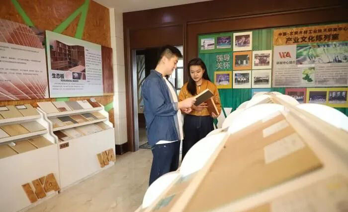 中国·文安县林产产业协会板材展厅,工作人员为顾客介绍人造板