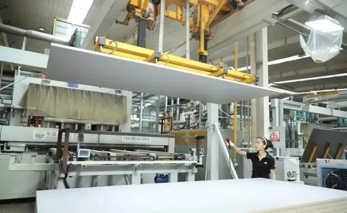 河北宜美康环保科技股份有限公司压贴车间,工作人员正在检验产品。