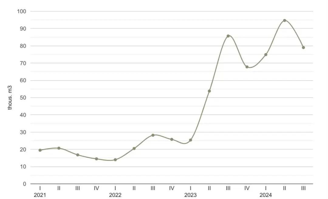 欧盟声称俄罗斯低价向中国出口用于胶合板生产的硬木锯材。2024年前八个月,俄罗斯对中国的硬木锯材出口量同比下降7.5%,至85.8万立方米,出口总值略微下降0.6%,至1.2亿美元。然而,锯材的平均价格却上涨了7.4%,达到每立方米140美元。与此同时,2024年1月至8月,俄罗斯对中国的硬木胶合板出口量同比激增74%,达到24.9万立方米,出口总值增长46%,达到1.25亿美元。然而,每立方米的平均价格下降了16%,至502美元。俄罗斯大量硬木胶合板流入中国,引发了外界对其可能以中国原产胶合板形式重新出口至欧盟的担忧,绕过欧盟对俄罗斯木材产品的禁令。