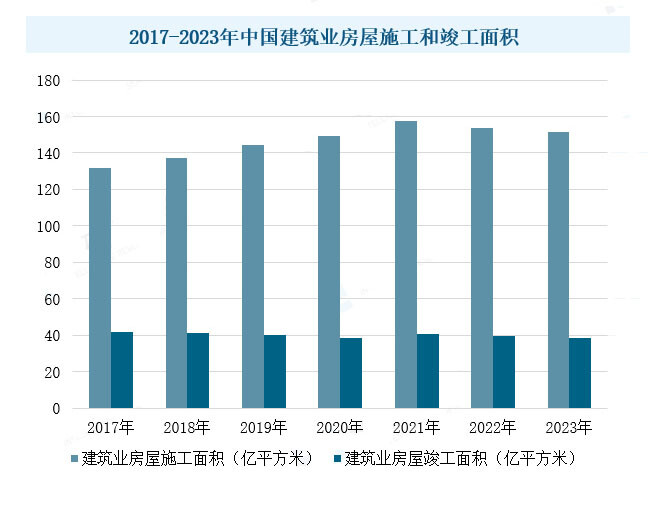 过去几年,建筑行业发展迅猛,建筑公司数量大幅增加,所运行的项目数量也不断增加。数据显示,2017-2021年,中国建筑业房屋施工面积持续增长,从131.84亿平方米增长至157.55亿平方米。2021年后,受经济不景气、政策调整等因素的影响,许多建筑企业投资意愿降低,建筑项目需求减少,导致建筑业房屋施工面积整体处于下降状态,2023年中国建筑业房屋施工面积达到151.34亿平方米,同比下降1.5%。而石膏板作为一种轻质建筑材料,因其轻便、易于安装、成本低廉且具有优良的隔音和防火性能,在建筑领域中占据重要地位。随着建筑业房屋施工面积的下降,石膏板的需求量将会受到一定影响。但值得注意的是,建筑业房屋竣工面积在2017-2023年间均保持在40亿平方米左右,所以整体来看,石膏板仍保持较高的需求量。