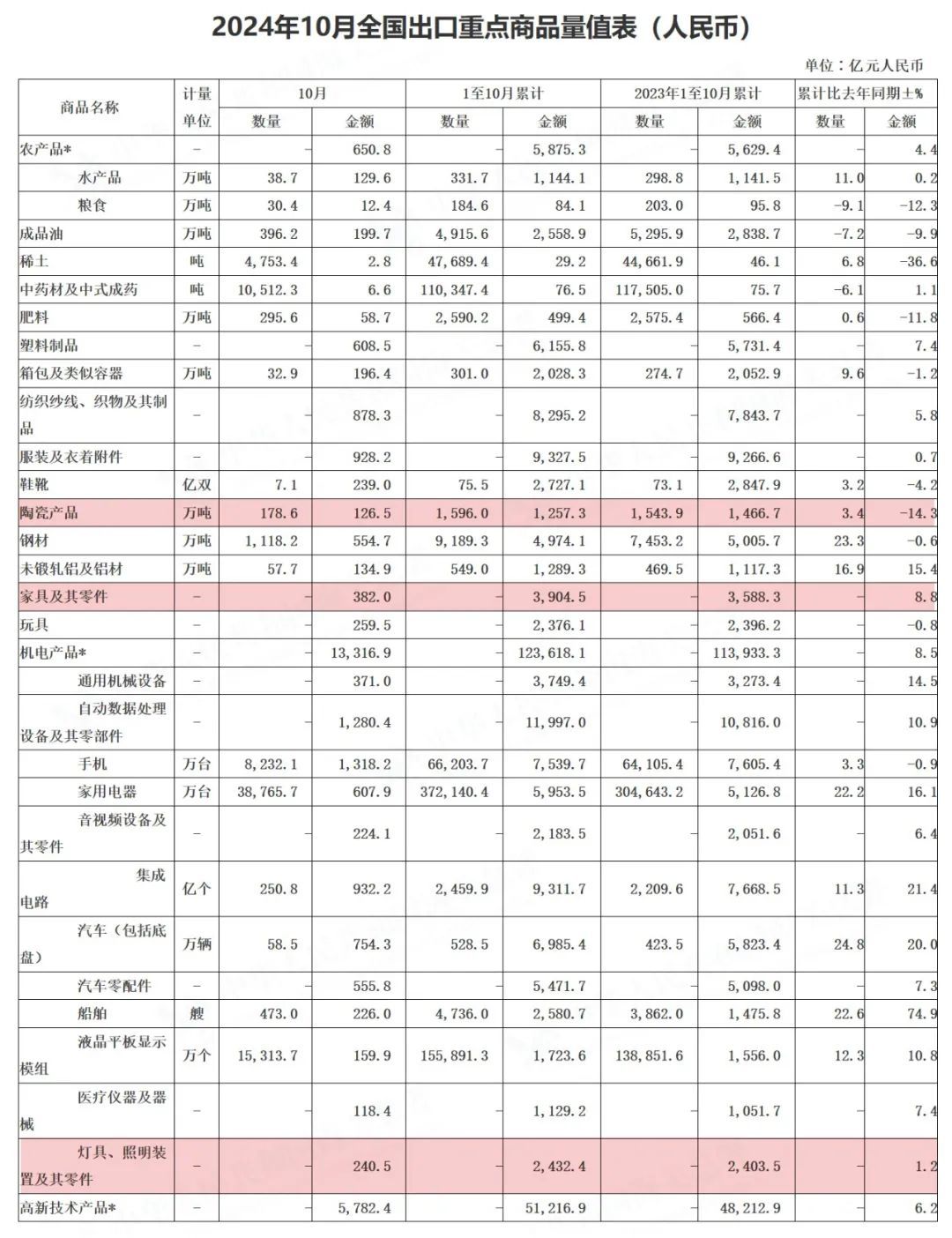 从10月份单月来看,家具、陶瓷及灯具等产品出口额环比上个月全线增长。其中,家具及其零件9月出口额为332.3亿元,10月382亿元,环比增长14.96%;陶瓷产品9月出口额为109.8亿元,10月126.5亿元,环比增长15.21%;灯具/照明装置及其零件9月出口额为225.5亿元,10月240.5亿元,环比增长6.65%。