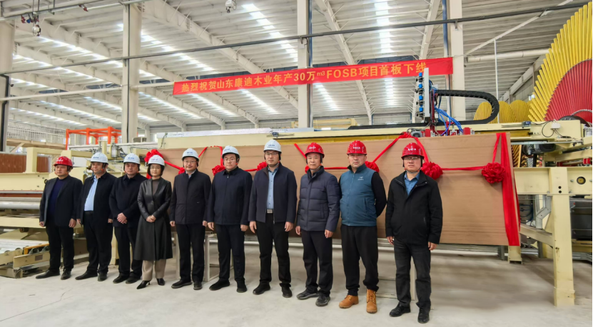 山东康迪木业年产30万立方米FOSB项目,作为2023年山东省重大项目、2024年临沂市重点项目,受到了各级政府及各级主管部门的大力支持和帮助。参与项目建设的各单位及项目组攻坚克难、通力协作,历时9个月按时完成各目标任务,顺利确保首板下线圆满完成。