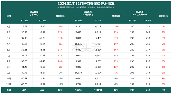 根据最新的海关数据,2024年11月,中国从泰国进口的橡胶木锯材总量达到了34.72万立方米,与10月的进口量基本持平,但与2023年同期相比下降了13%。进入第四季度以来,中国的橡胶木进口量呈现出明显的下滑趋势,尤其是在10月份,与9月相比,进口量大幅下滑了17%。