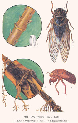 竹蝉又名大竹蝉、竹知了,属同翅目蝉科,我国分布于江苏、安徽、浙江、福建、江西、湖南,主要为害毛竹。