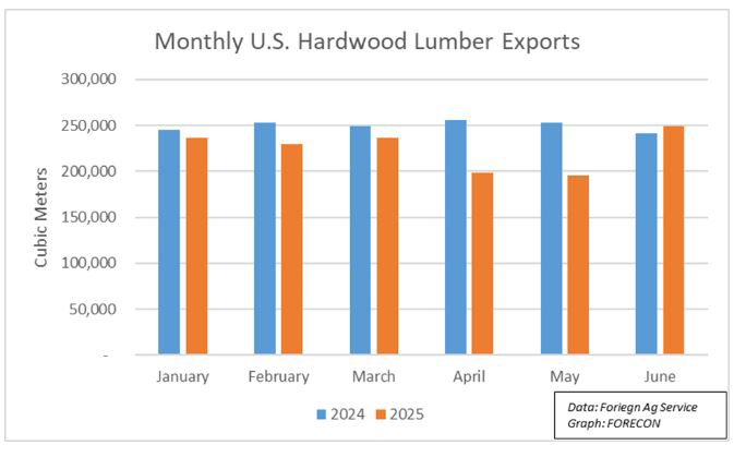 年初至今,2025年美国硬木木材出口量较2024年下降10%。但从单月数据来看,6月出口量较5月增长27%(详见下文),这一变化凸显出中国暂停美国原木加工业务所带来的非对称影响。