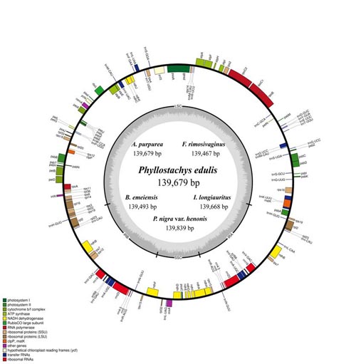 中国科学院昆明植物研究所李德铢研究组对木本竹子的研究有较好的研究基础。最近,该研究组选取1种热带竹子和5种温带竹子,利用新一代测序技术Illumina测定了这些种的叶绿体基因组全序列。通过与已知的2种竹子叶绿体基因组序列比对发现,竹亚科植物的叶绿体基因组非常保守,具有良好的共线性和较低的分子进化速率,并证实了通过改良高盐低pH法直接分离叶绿体DNA并测序这一方法的可行性。