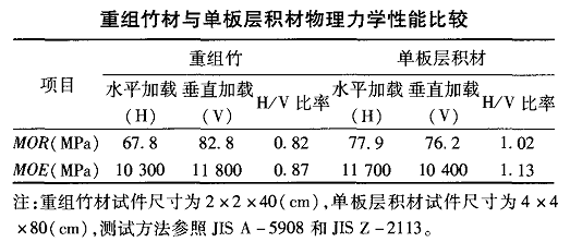 日本京都大学的Naresworo Nugroho 和Naoto Ando 也做了大量关于重组竹材的实验,研究院表明,不同的毛竹竹束宽度以及板材目标密度对重组竹材的弹性模量、静曲强度、内结合强度、吸水性和厚度膨胀率影响显著,但对线性膨胀率没有太大影响,通过多次的干湿循环试验表明,重组竹材仍具有良好的尺寸稳定性。在后续的研究中,他们又常试使用不同高温来预压竹束,随着温度从100度上升到180度,竹束展会量明显增加,下表为其制得的重组竹材各项力学性能与单板层积材比较表。美国的Mansui Ahmad 曾就竹条层积材做过系统的研究,试验选用加尔各答竹材,制得板材密度为0.78g/cm3时,静曲强度为125.9MPa,弹性模量为11661MPa。顺纹抗压强度为66.3MPa,经老化处理后,试件静曲强度和弹性模量明显降低,静曲强度隆至为95.6MPa,弹性模量为8927MPa,处理后65.4MPa。