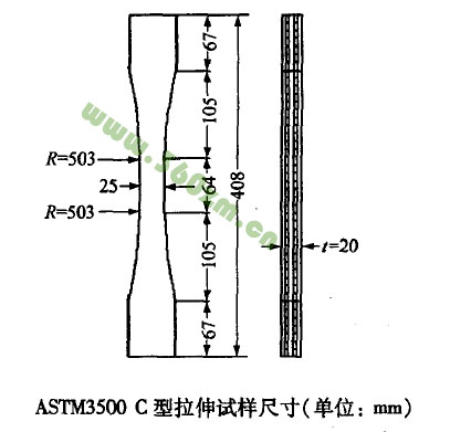 将加工好的竹青薄板层积材(500mm×220rain×25rnin(长×宽×厚))取出,放置24h后,在压刨上精加工成500InIn×200mm×20rain(长×宽×厚)的规格层积材板,按ASTMDesignadon:D3500—90(ASTM(R)):Standard Test Methods for Structural Panelsin Tension 的要求加工试件。每片规格层积板按平均分布的原则优先加工拉伸及杨氏模量试样,剩余材料加工压缩及密度试样.拉伸试样的加工尺寸见下图,5个试件为一组,取平均值。各种试件的检测在INs1RON 5582万能力学试验机上进行。