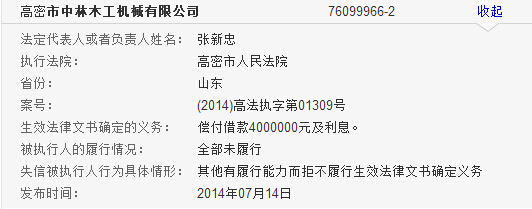 高密市中林木工机械有限公司被列入国家失信被执行人名单