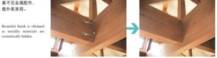 日本是世界上木结构建筑发展最好的国家之一。在成长过程中,他们吸收了从古代中国传来的木材建筑技术,当时工匠们凭着技术和经验不仅使木材充分发挥出自身的力量,而且将木材的“优”和“美”升华到了艺术的高度,出现了楔形榫头、雁劲接头、凸榫等连接方式,不仅衬托出了木结构的美,而且高度确保了施工的精度和结构的强度。近年来,为了提高抗震强度,开始使用许多强化作用的金属连接件,这在另一方面却破坏了木结构的美。为了解决这问题,日本开创了加藤式施工方法(APS方法)。该方法通过维护传统木结构的美和精度的基础上,采用嵌入式的AP插销,尽力减少安装金属连接件所需开孔开槽而对木材构件断面的损伤,提高了抗震强度。由于其金属配件整体嵌入木材,使外表更美观;与德国的施工方法相比,其大幅提高了房屋的防火性能和气密性能。由于不使用螺钉和螺帽,使房屋的基本结构接合牢固。坚固和扭矩拉紧作业也非常简便。