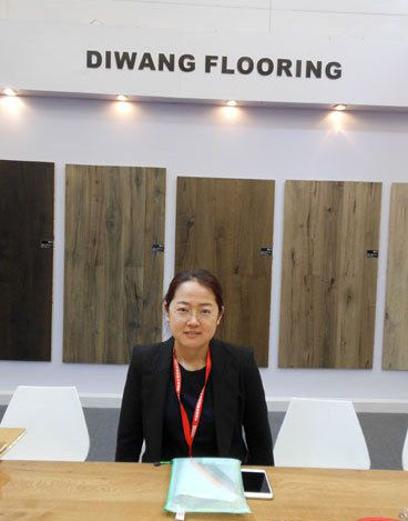 【郝胜男】:地王地板主要生产实木复合地板,90%出口欧美,有两条复合地板生产线,主要的产品是三层实木复合地板,推荐一种仿古的设计,大多应用在各种公共场所、咖啡吧、酒吧会所等;我们的产品外销欧洲北美都很多、例如瑞典荷兰,主要以加盟店实体店为主。