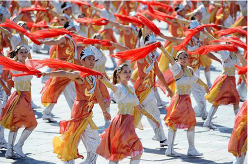 银色,金色,红色,不断变幻的服装颜色表现出时代的变革,象征伟大祖国在改革开放后万象更新,神州大地处处生机盎然。