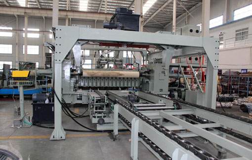 该旋切线由BD1513/26光环投影定心机、BQK1226/13数控液压单卡轴旋切机、BJG1326数控滚切单板剪切机、BDD1126/4单板堆垛机及辅助输送机械组成。该项目开发了拥有自主知识产权的碎单板剪切技术和剪切机对刀装置以及恒线速单板旋切技术和旋切卷板剪切同步技术,液压旋切机刀架进给、刀门开合调整、剪切机刀轴和单板输送采用了数控伺服电机驱动系统,并采用计算机控制系统对旋切生产线进行控制,实现了单板旋切生产自动化、柔性化、高精度、高效能。该生产线为胶合板和细木工板生产企业转型升级提供了先进的生产装备,在国内外具有广阔的市场前景。