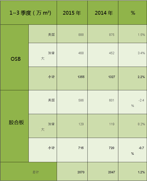 根据APA - The Engineered Wood Association公布的数据,2015年1-3季度美国结构人造板(胶合板、OSB)产量达到2070万m3,同比2014年增长1.2%,达到2008年以来的最高点。3季度产量708万m3,环比2季度增长3.2%。