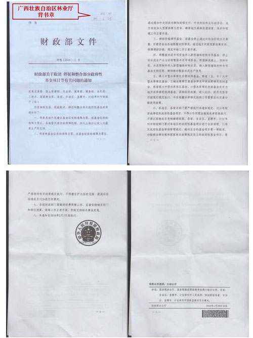 附:广西壮族自治区林业厅转发财政部(财税[2016]11号)文件至各区/市/县林业局(注意第一页右上角的背书章)