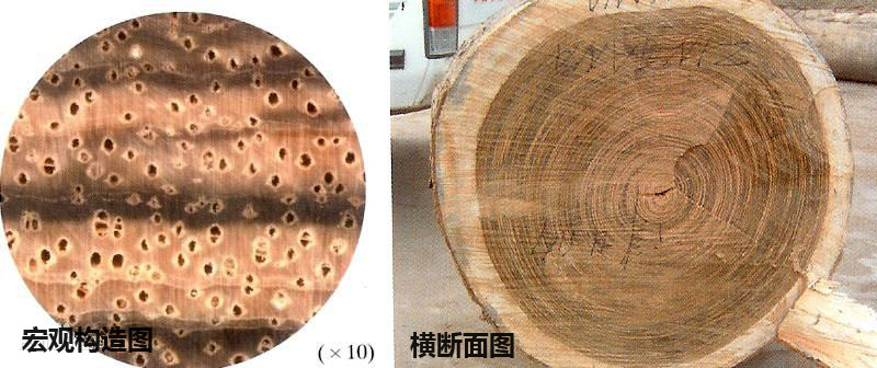 横断面:心边材区别明显。心材浅褐色,具深浅相间的同心圆状条纹,很明显。边材白色,宽8~10cm。生长轮略明显。